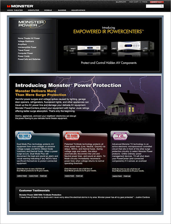 THE CHALLENGE: The challenge was to build an information architecture and navigation system that created intuitive paths to the products and information queried. We also needed to provide better educational content to address the customer’s confusion around Monster’s proprietary technologies.